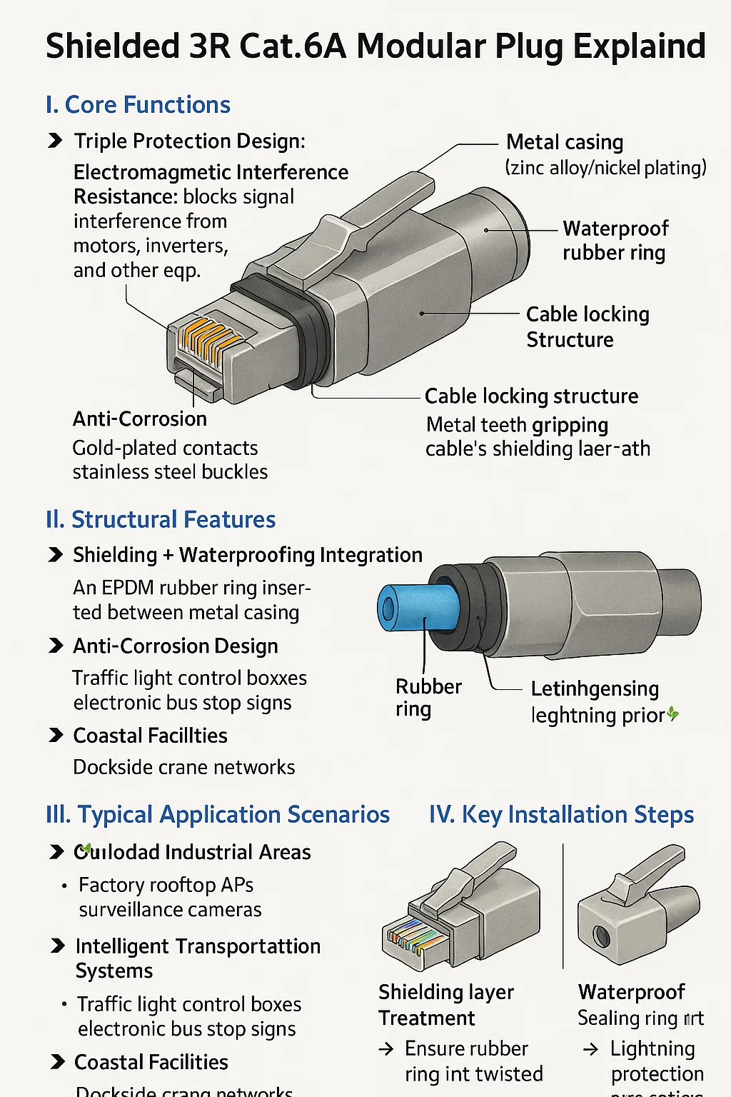 Tá fáinne rubair EPDM leabaithe i imeall an chásáil miotail, ag soláthar an dá thalamh sciath agus cosaint splancscáileán IP54 tar éis an rocadh.