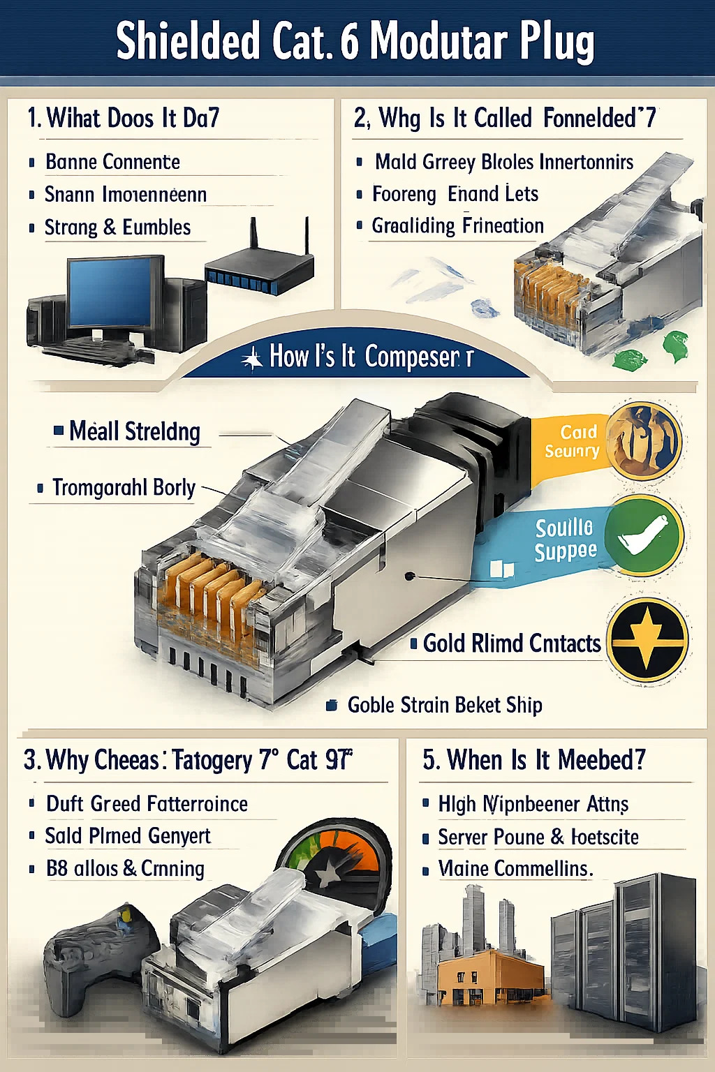 seo mbí Cat.6 breiseán modúlach , a chur go simplí, is cónascaire cábla líonra le "sciath cosanta." Má tá nascóirí cábla líonra feicthe agat le cásáil miotail lonracha, sin é.